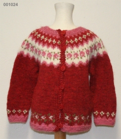 Rauð hneppt Barnalopapeysa með bleiku og hvítu mynstri.