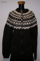 Dökkbrún rennd lopapeysa með Hvítu og dökkbrúnu mynstri.