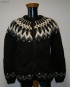 Hærusvört rennd lopapeysa með hvítu, gráu og svörtu mynstri.